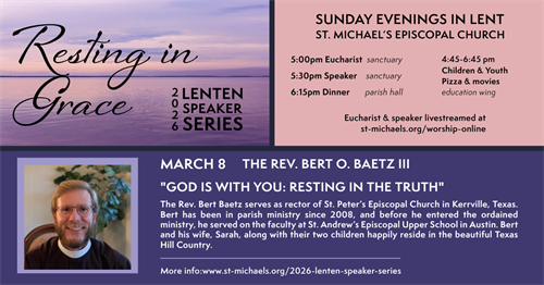 Event Description:Resting in Grace: 2026 Lenten Speaker Series | Sunday evenings February 22 - March 22 You’re invited to St. Michael's 2026 Lenten Speaker Series--Resting in Grace each Sunday evening in Lent. On March 8, we welcome the Rev. Bert O. Baetz III; his talk is "God is With You: Resting in the Truth. Bert serves as rector of St. Peter’s Episcopal Church in Kerrville, Texas. He and his wife, Sarah, along with their two children happily reside in the beautiful Texas Hill Country. This will be livestreamed at www.st-michaels.org/worship-online, and we post the recording online at st-michaels.org/2026-lenten-speaker-series.