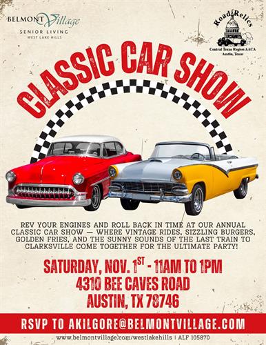 Name: Belmont Village West Lake Hills Classic Car Show 2025Date: November 1, 2025Time: 11:00 AM - 1:00 PM CDTEvent Description:Classic Car Show at Belmont Village West Lake Hills