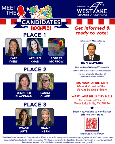 Name: Candidate Forum for Eanes ISD School Board of TrusteesDate: April 13, 2026Time: 6:00 PM - 8:00 PM CDTRegistration: Register Now